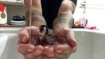 Elle fait boire un chien dans ses mains et regardez comment il la remercie