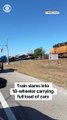 A train collided with an 18-wheeler carrying a full load of cars after it got stuck on tracks in Schertz, Texas on Sunday. No one was injured in the crash. #texas