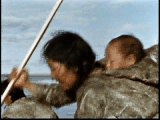 Inuit fishing in Northern Canada during the spring/summer months. They are using kakivat, or spears along with mitqun or a fish needle.