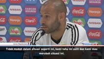 Javier Mascherano menahan tangis saat berbicara dalam acara perpisahan dirinya yang meninggalkan Barcelona
