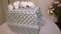 ***HERES HOW TO GET THE CARDS OUT***\r<br>You get cards out from the bottom of the box. I didnt say it on video but stated it in writing when I added candle holders (legs) to the bottom of the box, so please be careful not to block exit (Cardboard & Tabs) when gluing legs. Very sorry for the confusion. \r<br>\r<br>Hi guys!\r<br>In this video Im going to show you how to make a Bling Wedding Card Box with items from Dollar Tree. This DIY is great for Bling Weddings, Bridal Showers, or any Glam celebration. \r<br>I absolutely love this mirror bling card box. Hope you do too! :)\r<br>\r<br>Thanks for Watching!\r<br>\r<br>Heres what I used:\r<br>-Dollar Tree-\r<br>6 Mirrors (Black Frame)\r<br>2 Multi photos Frames (2.5 X 3.5/5x7)\r<br>3.5X5 Picture frame\r<br>Certificate of Achievement Frame (only need glass)\r<br>Diamond Wrap\r<br>\r<br>-Michaels-\r<br>Diamond Ribbon/Wrap (Roll of 3 Yards)\r<br>Silver Spray paint\r<br>\r<br>*Hot glue gun + glue stick and Transparent E6000\r<br>\r<br>