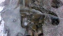 ICE WALKING! Man cautiously tiptoes across a glassy Lake Baikal in the mountainous Russian region of Siberia.