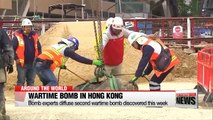 Another unexploded bomb dropped during World War II has been found in Hong Kong.<br />The discovery, coming just a week after another one was unearthed in the same area,... prompted the authorities to evacuate five thousand people.<br />Lee Seung-jae reports. <br /> It's 140 centimeters long, 45 centimeters wide and weighs in at a staggering 450 kilograms.<br />The AN-M65,... made by the United States and dropped on Japan-occupied Hong Kong during World War 2,.. was discovered at a construction site in Hong Kong's Wan Chai district,... as experts worked through the night to disarm the "severely damaged" explosive. <br />This discovery comes less than a week after an identical model was defused in the same area. <br />While it's not uncommon for unexploded armaments from past wars to be found in the territory,... a bomb disposal expert stressed the difficulty in diffusing such an old explosive.<br /><br /> "Because of the rain yesterday, the working conditions are not good. Because of the location, it was extremely difficult to access it, and because of the nature of the fire mechanisms, the fuses, one of the which we couldn't even see, it was extremely dangerous for the officers who were engaged in the disposal operation."<br /><br /> The explosive is known to have be made by the United States and dropped on Japan-occupied Hong Kong during World War Two,... as the area was a British colony at the time,... and occupied by Japanese forces between 1941 and 1945. <br /> Hong Kong historians estimate that, of the approximately four-thousand explosives,... roughly 30 percent, or nearly a thousand were buried underground,... and are yet to be discovered.<br /> Experts say a large number of similar bombs may be buried in Japan's Okinawa, Cambodia, Laos, and other regions that saw conflict during World War 2.<br />Lee Seung-jae, Arirang News. <br />