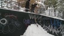 A woman has filmed her husband skiing down a road in Kent, south-east England.<br /><br />The video shows the man braving the elements and skiing in along the road in a pair of jeans. <br /><br />On social media, the filmer posted the video with the comment: "Siilverdale Road Blue Run!" <br /><br />The video was filmed yesterday (February 27).<br /><br />The heavy snowfall was due to a large cold front, popularly called "The Beast From The East", which is bringing snow, ice and cold winds across much of the UK.<br /><br />Kent has been one of the worst-affected areas.