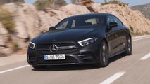 The front apron of the CLS53 4MATIC+ features additional side air curtains: the air flows over them in a targeted manner, thereby improving the aerodynamics at the front and reducing the Cd figure. The front splitter connects seamlessly with the air curtain and reduces lift at the front axle. The outer lines of the radiator grille widen towards the bottom and lend the CLS a powerful appearance. Also making a contribution here are the sharply cut, narrow headlamps. The exterior mirrors are positioned on the doors, as in the AMG GT models, ensuring an even more dynamic look. The two-section tail lights visually reinforce the sense of width of the rear and as an additional practical benefit allow for the large boot opening. The broader track width combines better cornering with a perfect look thanks to the wheels being positioned further out. As standard the CLS53 comes with 19-inch aerodynamically optimised light-alloy wheels, and as an option 20-inch wheels can be ordered.