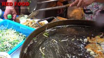 Thai street food vendor selling beaten egg omelettes, fried with mussels and/or cuttlefish and fresh shrimp.