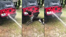 Brett, de Géorgie aux Etats-Unis, essaie en vain de nettoyer sa Jeep au tuyau d'arrosage, mais il y a un élément perturbateur. Son chien saute à plusieurs reprises pour essayer d'attraper le jet d'eau, il a l'air de bien s'éclater !