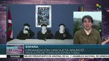 La organización independentista vasca Euskadi Ta Askatasuna (traducida al castellano como "País Vasco y Libertad"), conocida por sus siglas ETA, anunció la completa disolución de sus estructuras e iniciativas políticas. Por medio de una misiva afirman que dan por terminado su "ciclo histórico" y lamentan los efectos del conflicto con España. "Lo sentimos de veras", expresaron. teleSUR.