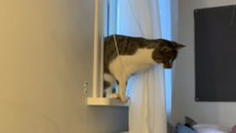 Our Manx is a tailless cat only having a little bobbed nub to offer next to no balance or support, so sometimes, unless she has something to snag with her claws, she just doesnt have the balance to pull off the simplest of cat behaviours... even with a tote for extra height!! Fortunately she has many places in here in which to do so but not the window. She spotted a young squirrel in the tree and wanted a closer look but just couldnt make the leap... poor girl.