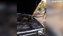 Stomach churning footage shows the moment a 12ft-long python was pulled from a car engine. Shopkeeper Tee Natwijit, 57, was horrified when customers told him they had seen the python's tail wiggling out from under the bonnet. The printing business boss ran over to his Isuzu Grand Adventure 4x4 and recoiled when he lifted the lid and saw the beast glaring back at him.
