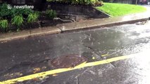 A manhole cover was filmed "dancing" in heavy rain in southern China on Thursday (June 7). <br /><br />The unusual sight was captured in Jiangmen City in southern China's Guangdong Province.<br /><br />The clip shows the manhole plate violently moving up and down.<br /><br />While the water from a sewer nearby comes up and down with it at the same time.<br /><br />According to reports, the phenomenon was caused by poor drainage facilities as waste from a nearby sewer forced the plate to move up and down.<br /><br />++CLIENTS PLEASE NOTE: THIS VIDEO HAS BEEN LOOPED++