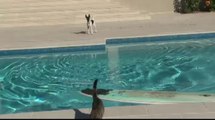 Un chat fait du surf pour semer un chien