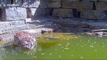 Occurred on June 26, 2018 / Thixendale, Malton, North Yorkshire, UK<br /><br />Info from Licensor: "Wildlife artist, Robert E Fuller, caught this tawny owl bathing in brilliant sunshine. The artist, who uses wildlife cameras to follow the day to day lives of wildlife in his garden, said it was very unusual to see a tawny owl bathe during the day. These birds are nocturnal and rarely come out to bathe like this in daylight. But what is particularly unusual is to see a tawny owl drinking. Most birds of prey get their moisture from their food. This bird is really gulping down the water."