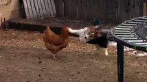 this duck is too clever for the simple-minded dog, it played dead in front of the dog and ran for it when the dog was gone from its sight.