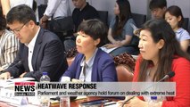 기상청, 국회서 '폭염 진단 및 대응 방안' 토론회<br /><br /> As scorching heat continues to grip the nation.<br />Parliament and the nation's weather agency have put their heads together to come up with measures to battle the heat.<br />Kim Mok-yeon has the highlights from that session. <br /> The National Assembly and the Korea Meteorological Administration held a special forum on Monday aimed at responding to the nation's worsening heatwaves.<br />It brought together more than a hundred people, including experts in the industry, and three lawmakers on parliament's environment and labor committee.<br />In his opening remarks, the chief of the weather agency said the heatwaves should be addressed in terms of all the ways they affect society.<br /><br /> "I'm expecting today's forum to diagnose the current heatwave problem from various perspectives... and to come up with futuristic and practical countermeasures."<br /><br />The forum began with lectures about how heatwaves are likely to change in the future, an analysis of their characteristics and then possible responses.<br /> The speakers stressed that technology needs to be used to improve forecasting, pointing out that the current system cannot predict heatwaves beyond the next 10 days.<br /> They also spoke about the expansion of public benefits for those most vulnerable to the heat, such as farm and factory workers... and some foreigners who could be more sensitive to heat related illnesses. <br /> One lawmaker in attendance said that meteorological disasters could be handled better if people paid more attention to them, and promised the National Assembly's utmost support.<br /><br /> "I hope the discussions in today's forum can act as a stepping stone to ultimately solving the heatwave problem. I hope today's event can pave the way to a legal, systematic solution.."<br /><br />South Korea has been under dangerously hot temperatures in the past couple of weeks.<br /> And with more coming in the next ten days, this summer could beat out 1994 as the country's hottest year on record.<br /><br />Kim Mok-yeon, Arirang News. <br />
