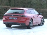 La 508, c’est la familiale de Peugeot. Cette deuxième génération, si elle a gardé le nom de sa devancière, a quasiment tout changé pour le reste. D’abord techniquement puisqu’elle utilise désormais la plateforme EMP2, la même que les 308, 3008, etc. Elle a aussi changé en design, comme vous pouvez le voir, et même en concept puisque la précédente 508 était berline tricorps, classique, alors que celle-là adopte désormais le principe du coupé 4 portes, comme une VW Arteon, une A5 Sportback ou une Série 4 Grand Coupé. Cette 508 est un peu plus courte que sa devancière et beaucoup plus basse. En termes de motorisation, on essaie ici un diesel de 160 ch qui vient se placer en millieu de gamme puisqu’il y a un 130 ch en entrée de gamme et un 180 ch en haut de gamme diesel. Ce bloc 160 ch est uniquement disponible avec une boîte automatique à 8 rapports. Notre modèle d’essai est en finition GT Line, typée sport, qui se reconnaît entre autres au bas des boucliers noirs ou à l’entourage des vitres également noir.
