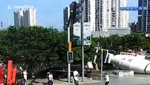 This is the terrifying moment a cement tanker ran over a scooter driver who was knocked down by a car door in eastern China.<br /><br />The CCTV video, filmed in Jinhua City in Zhejiang Province on Tuesday (August 7), shows a driver suddenly opening his door, knocking down a scooter driver passing by.<br /><br />The scooter driver spins away on the ground before her head is run over by a cement tanker.<br /><br />The car driver goes to check on the woman immediately and calls the police.<br /><br />According to reports, the woman scooter driver lying on the road told the driver her family’s number and asked him to contact them. Later, the woman was taken to hospital in an ambulance.<br /><br />Thanks to the woman's helmet, she escaped death with only minor head injuries.<br /><br />Reports later said the case was being investigated by police.