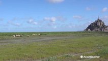 A huge torrent of mud and rocks pushes through a channel and onto a road in Chamoson, Switzerland on August 7.