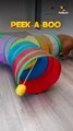 River the cat was playing in a toy tunnel while Jessie the dog waited for them to climb out. However, when Jessie bounced to the other side to try and find them, River darted out of the toy and hid behind the couch without being seen.
