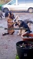 Tres tigres blancos amamantados por una Pastor Alemán