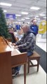 Cet homme joue sur un piano offert à ce magasin