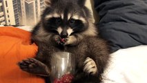 Raccoon Eats Bowl of Pomegranate Seeds