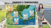 Good afternoon. It's another day with big temperature fluctuations, there'll be temperature gaps of nearly 10 degrees Celsius so be sure to dress accordingly. <br /><br /> For most of the day, many regions can enjoy fine autumn skies UV rays will be high while the air is getting drier as well. But there's not much to complain about in terms of the weather.<br /><br /> Most parts can expect a big jump in the readings by the afternoon, Seoul should get up to 27 degrees. Daegu and Gyeongju will top out at 24 degrees.<br /><br /> The weather looks promising for the next couple of days before rain falls across the nation on Friday, Seoul will see rain lingering into Saturday morning. <br /><br />With that, let's take a look at the international weather for viewers around the world. <br />
