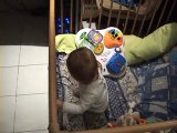 Alexis debout dans son trotteur
