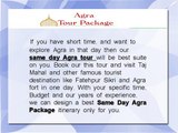 Agra is always popular destination in India also top of the list of travelers who visited India. Usmani Taj Tours offer you same day agra tour which takes you all the historical sites of Agra City at very reasonable price. <br />http://www.usmanitajtours.com/same-day-agra-by-car.html <br />email: info@usmanitajtours.com <br />Contact: +91-7830302098