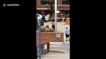 Delivery drivers working for Uber Eats have staged a large protest stopping traffic outside the company's headquarters in Aldgate this afternoon (September 20).<br /><br />The protest that started at 2:00pm and made its way to the East London office on Commercial Road, citing a dispute over pay. The police were called and the road was blocked by hundreds of the demonstrators.<br /><br />Following a wage cut per delivery of up to half, drivers have been refusing to log into their work accounts or deliver any food. <br /><br />The filmer said: "There have been clashes with police and Aldgate Tower, which houses Uber, has been put on lockdown."