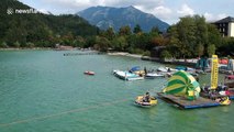 Austrian stuntman demonstrates extreme Vespa waterskiing