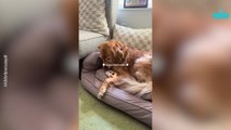 This dog and toddler duo were having a great time together, snuggling with each other in the dog's bed and rolling around on the floor.
