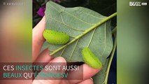 Deux insectes vert fluo dévorent une feuille d'avocatier