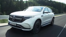 Auf dem Pariser Autosalon 2016 hat Mercedes-Benz erstmals seine neue Produkt- und Technologiemarke für Elektromobilität präsentiert. Mitte 2019 ist es so weit: Mit dem EQC (Stromverbrauch kombiniert: 22,2 kWh/100 km; CO2-Emissionen kombiniert: 0 g/km, vorläufige Angaben)1 kommt das erste Mercedes-Benz Fahrzeug der Marke EQ auf die Straße. Mit seinem nahtlosen, klaren Design und markentypischen Farbakzenten ist er Vorreiter einer avantgardistischen Elektro-Ästhetik und vertritt zugleich die Designsprache des Progressiven Luxus. In puncto Qualität, Sicherheit und Komfort ist der EQC der Mercedes-Benz unter den Elektrofahrzeugen und überzeugt in der Summe seiner Eigenschaften. Hinzu kommt die hohe Fahrdynamik dank zweier Elektromotoren an Vorder- und Hinterachse mit zusammen 300 kW Leistung. Dank einer ausgeklügelten Betriebsstrategie ist eine elektrische Reichweite von über 450 km nach NEFZ (vorläufige Angaben)1 möglich. Mit Mercedes me bietet EQ umfassende Services und macht Elektromobilität bequem und alltagstauglich. Zugleich ist der EQC Sinnbild für den Beginn einer neuen Mobilitätsära bei Daimler.<br /><br />Als erstes Mercedes-Benz Modell der neuen Produkt- und Technologiemarke EQ hat der Mercedes-Benz EQC viele wegweisende Designdetails und markentypische Farbakzente. Außen wie innen verkörpert der EQC die Designsprache des Progressiven Luxus. Dieser entsteht durch das Zusammenspiel einer bislang unbekannten Schönheit, dem bewussten Aufeinandertreffen digitaler und analoger Elemente sowie dem nahtlosen ineinander Übergehen von intuitivem und physischem Design.<br /><br />Aufgrund seiner kraftvollen Proportion zählt der EQC zu den Crossover-SUV. Die gestreckte Dachlinie und die Scheibengrafik mit einer tief positionierten Bordkante und dem coupéhaften Dacheinzug am Heck positionieren ihn optisch zwischen einem SUV und einem SUV-Coupé.<br /><br />Prägnantes Merkmal der Front ist die große Black-Panel-Fläche, die die Scheinwerfer und den Grill umschließt. Den oberen Abschluss des Black Panels bildet erstmals ein Lichtleiter als optische Verbindung zwischen den Mercedes‑Benz typischen Tagfahrlicht-Fackeln. Bei Nacht entsteht ein nahezu durchgängiges, horizontales Positionslichtband. Innengehäuse und Tuben der serienmäßigen MULTIBEAM LED Scheinwerfer sind in glänzendem Schwarz ausgeführt. Farbliche Kontrastelemente unterstreichen dezent die Zugehörigkeit zur neuen EQ Familie: blaue Streifen auf schwarzem Grund und ein ebenfalls blauer MULTIBEAM Schriftzug.<br /><br />Auch im hochwertigen Innenraum ist der EQC Vorreiter einer avantgardistischen Elektro-Ästhetik. Ein Beispiel dafür ist der Lamellenkragen der Instrumententafel, der an die Kühlrippen eines Hi-Fi-Verstärkers erinnert. Die Instrumententafel ist als fahrerorientiertes Cockpit konzipiert. Das Mercedes-Benz typische Flügelprofil ist asymmetrisch ausgeführt und wurde im Fahrerbereich „aufgeschnitten“. Dort befindet sich eines der optischen Highlights des Cockpits - eine technisch anmutende, hochglanzlackierte Kassette, in der flach bauende Lüftungsdüsen mit schlüsselförmigen, roségoldfarbenen Lamellen sitzen.