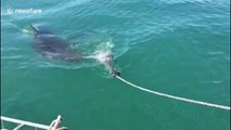 This is the heart-stopping moment a shark breaches just a few inches from a cameraman during a diving trip.<br /><br />The near miss happened in Mossel Bay, South Africa, on October 14.<br /><br />“A very active white shark had been around the cage for 30 minutes,’’ said the filmer.<br /><br />‘’All of a suddenly after a failed attempt to get the bait the shark lunged towards me.’’