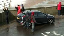 An Express train was battered by the sea whilst travelling along the coast of Dawlish, Devon, during Storm Callum.<br /><br />The footage filmed by one of the passengers shows big waves hitting the train.<br /><br />High tides are still causing problems on the rail line along the sea wall in Dawlish.<br /><br />The clip was filmed on Friday (October 12).