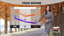 날씨: 내일 아침 기온 영하권<br /><br />Now we turn to Michelle Park at the weather center for the latest updates. Michelle, temperatures are expected to drop drastically overnight,... leading us to what could be the coldest day of the season to date, right?<br />Daniel, yes, today the mercury hit the lowest so far this season,... but it looks like that's going to change just within a day. Northern areas of the country will wake up to freezing readings, especially the regions in dark blue on the map. <br />But the cold conditions will be very short-lived. In fact, temperatures will bounce back in the afternoon. Meanwhile, Beijing and Tokyo will continue under balmy autumn conditions tomorrow. <br />Tuesday morning in Seoul drops to 1 degree Celsius, and Chuncheon hits minus 1,... while Jeju remains relatively warm at 13 degrees.<br />Seoul is expected to warm up to 10 degrees by the day. Daegu and Gyeongju will be a bit higher at 14 degrees.<br />Colder than seasonal average mornings are expected to continue until Friday,.. and from then, the temperature readings should return to seasonal averages.<br />I'll leave you with the weather conditions around the world. <br />