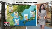 Good morning, the country had a very cold start to the day with widespread frost. <br />In fact Seoul and Suwon saw the first ice of the season which came on the exact same day as last year. The morning low in Seoul was below 1 degree Celsius, and it was minus 8 degrees on Seoraksan mountain....<br /><br />Daily highs in Korea will also be 2 to 5 degrees lower than yesterday in most parts under mainly sunny skies with cold but good quality air.<br /><br />Daily highs will range between 10 and 16 degrees. Seoul will only reach 10 degrees, Jeju and Busan will enjoy late autumn weather topping out at 16 and 15 degrees. <br /><br />The autumn cold snap will ease starting Friday afternoon, just in time for those who plan to enjoy the one last glimpse of late autumn weather this coming weekend,... but until then dress warmly and take good care of your health to avoid catching a cold. <br /><br />That's Korea for you and here's the international weather for viewers around the world.<br />