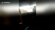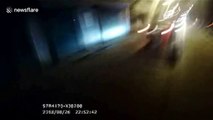 This is the dramatic moment an unlicensed driver sped down a road with a police officer sprawled across the bonnet of his car.<br /><br />Security camera footage, filmed in Xining City in Qinghai Province on November 2, shows the police officer lying on the bonnet of a white car as it speeds down a road. <br /><br />The police officer's colleagues can be seen giving chase.<br /><br />After more than 200 metres, the police officer finally falls into the road and the reckless driver flees. <br /><br />According to reports, the driver rammed the officer after he asked to see the driver's license. <br /><br />The police officer was later treated in hospital for his injuries.<br /><br />Police arrested the driver within 24 hours and he was detained.
