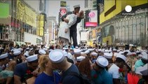 Onlookers cheered as a man wearing a Navy costume and a woman in a white dress embraced and locked lips at the annual NYC Veterans Day parade, re-enacting the famously photographed V-J Day Times Square kiss.<br /><br />This video shows Theresa Werner and James Martin, a swing dance couple that performs with military veterans, displaying their re-enaction of the well-known Alfred Eisenstaedt photograph in which a US Navy sailor is seen grabbing and kissing a stranger after the US victory over Japan was announced on August 14, 1945.