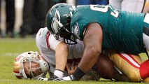 The San Francisco 49ers' entire DL gets to Denver Broncos quarterback Case Keenum for a big third-down sack and loss of 10 yards.