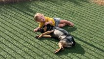 This adorable dog climbed on a bench in the vet's clinic in a relaxed manner. They placed their paw in the vet's hand calmly and sat patiently while he gave them a shot.