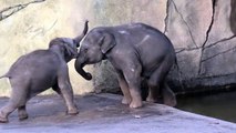 An elephant calf at a zoo in Germany was filmed trying to push his big brother into a water pool in their enclosure.<br /><br />The baby male elephant seems to have the knack at annoying his big brother by often play-fighting with him, though the patient older brother does not push back this time.<br /><br />“This one is trying it's best to push the bigger one into the water. He keep running into him and pushes again and again,” the filmer told Newsflare.