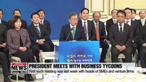 문 대통령, 기업인들과 자유토론,... 혁신 투자, 고용 등 당부<br /><br />President Moon Jae-in met with the top decision-makers of the nation's leading conglomerates and big companies for talks on pending economic issues. <br />The South Korean leader called on the business tycoons to do their part in creating jobs and investing in the local economy.<br />Shin Se-min starts us off. <br />Business executives gathered at the top office for a talk with President Moon... including Samsung Electronics' Vice Chair Lee Jae-yong, Hyundai Motor's Chung Eui-sun, LG's Koo Kwang-mo and Choi Tae-won of SK Group,... -- in all, executives from 130 leading businesses.<br />The president called on them to help breathe life into the country's slowing economy with the focus on job creation and local investment from large firms.<br />This was round two of the president's free-style discussions with business leaders, following the one last week with SMEs and venture firms, and it was designed to give the participants a chance to speak frankly. <br />President Moon said the country's top 30 businesses are the ones most preferred by young jobseekers,... and talked up their role in providing job opportunities over the past five years.<br />"Creating quality jobs is the most urgent issue facing our economy. You all have done well so far but I ask you once again to spearhead efforts to create new jobs. Pay extra attention to this issue."<br />Adding that the government's goal this year is to create a foundation for companies to leap forward,... the president said he hopes to see more investment in new industrial sectors and new technologies and products to spur future growth engines.<br />In the discussions, the chief of Korea's telecommunications carrier KT suggested that the government ease regulations on data privacy, and SK Group's chairman asked for the administration to make progress on bills to help the country's social enterprises.<br />The president, expressing optimism, said that by combining their strengths, the government, businesses, labor and mangement can overcome these difficulties and revitalize the economy.<br />The president also promised the government's active collaboration in securing the companies' global compatitiveness -- as that will lead to the nation becoming more powerful and prosperous.<br />Shin Se-min, Arirang News.