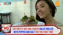 The pretty hot girl enjoys balut grilled with pepper and salt for the first time