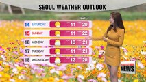 Good morning, you will enjoy today's fine early spring weather, temperatures will go a couple notches higher under mostly sunny skies. It will be warmer tomorrow but nationwide rain in the middle of the week bring down the highs to single digits by the end of the week. <br /><br />What's more, air quality will be decent, we'll have normal to good air across much of the country, afternoon walking should be pleasure with protective sun-screen, but regions in the east will have dry conditions with a dry weather advisory in place. <br /><br />Now to today's temperatures, most areas had a chilly start to the day but will turn mild later with highs jumping more than 10 degrees in many areas, so dress accordingly. <br /><br />For a closer look, Seoul will top out at 14 degrees Celsius, Daegu and Gyeongju will get up to 17 degrees. There'll be mostly sunny skies, while Jeju will see light showers in the evening. <br /><br />That's Korea for you and here's the international weather for viewers around the world.<br />