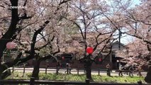 Tourists take selfies and pictures as the cherry blossom blooms at its peak in Tokyo, Japan, on March 29, 2019. <br /><br />The beautiful scene attracts holidaymakers every year from around the world to admire the pink "Sakura."<br /><br />The footage was filmed outside the Imperial Palace where thousands of people gathered to see the cherry blossom that lines the moat, which is now used for boating. <br /><br />Japan's climate means that tree blossom in the country's springtime produces a beautiful display of colour.
