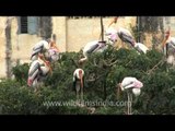 The Painted Stork (Mycteria leucocephala) is a large wading bird in the stork family. It is found in the wetlands of the plains of tropical Asia south of the Himalayas in South Asia and extending into Southeast Asia. Their distinctive pink tertial feathers give them their name. They forage in flocks in shallow waters along rivers or lakes. They immerse their half open beaks in water and sweep them from side to side and snap up their prey of small fish that are sensed by touch. As they wade along they also stir the water with their feet to flush hiding fish. They nest colonially in trees, often along with other waterbirds. They only sounds they produce are weak moans or bill clattering at the nest. They are not migratory and only make short distance movements in some parts of their range in response to food and for breeding. Like other storks, they are often seen soaring on thermals. <br /> <br />Source- Wikipedia <br /> <br />This footage is part of the professionally-shot broadcast stock footage archive of Wilderness Films India Ltd., the largest collection of imagery from South Asia. The Wilderness Films India collection comprises of thousands of hours of high quality broadcast imagery, mostly shot on HDCAM 1080i High Definition, HDV and XDCAM. Write to us for licensing this footage on a broadcast format, for use in your production! We are happy to be commissioned to film for you or else provide you with broadcast crewing and production solutions across South Asia. We pride ourselves in bringing the best of India and South Asia to the world... Reach us at wfi @ vsnl.com and admin@wildfilmsindia.com.