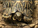 The Indian star tortoise scientifically known as Geochelone elegans, belongs to a species of tortoise found in semi-arid grassland and scrub forest of India and Sri Lanka. The Star tortoise is a herbivorous animal and grazes primarily upon mixed grass. They also feed on opuntia (prickly pear) cactus, succulents, flowers, and weeds. Unlike other tortoise the star tortoise does not. It is one of the much sought after among exotic pets. <br /><br />They are commonly found in Ceylon and peninsular India and in the areas along the westward of Sind. The star tortoise has also been spotted on the Island of Karaduva and Ramaswaran. <br /><br />Anatomy and morphology<br /><br />Carapace very convex, dorsal shields often forming humps; lateral margins nearly vertical; posterior margin somewhat expanded and strongly serrated; no nuchal; supracaudal undivided, incurved in the male; shields strongly striated concentrically; first vertebral longer than broad, the others broader than long, third at least as broad as the corresponding costal. Plastron large, truncated or openly notched in front, deeply notched, bifid behind; suture between the humerals much longer than that between the femorals; suture between the pectorals very short; axillary and inguinal rather small. Head moderate; forehead swollen, convex, and covered with rather small and irregular shields; beak feebly hooked, bi- or tricuspid; edge of jaws denticulated; alveolar ridge of upper jaw strong. Outer-anterior face of fore limb with numerous unequal-sized, large, imbricate, bony, pointed tubercles; heel with large, more or less spur-like tubercles; a group of large conical or subconical tubercles on the hinder side of the thigh. Carapace black, with yellow areolae from which yellow streaks radiate; these streaks usually narrow and very numerous: plastron likewise with black and yellow radiating streaks. The Indian star tortoise can grow 10 inches long. <br /><br />The patterning although highly contrasting is disruptive and breaks the outline of the tortoise as it sits in the shade of grass or vegetation. They are mostly herbivorous and feed on grasses, fallen fruit, flowers and leaves of succulent plants, and will occasionally eat carrion. In captivity however they should never be fed meat.<br /><br />The sexual dimorphism of adult Indian star tortoises is quite apparent. Females are considerably larger than their male counterparts. In addition, the females plastron is much flatter than that of the males which has a concave shape.<br /><br />The shape of this creature is presumed to be specially adapted to naturally assist it to return to a stable stance after it has been turned over. Mathematicians Gábor Domokos of the Budapest University of Technology and Economics and Péter Várkonyi of Princeton University designed a homogenous object called Gömböc that has exactly one unstable balance point and exactly one stable balance point. Just as a bottom-weighted (non-homogenous weight distribution) sphere would always return to the same upright position, they found it was possible to construct a shape that behaves the same way. After that, they noted the similarity to the Indian Star Turtle and subsequently tested 30 turtles by turning them upside down. They found that many of them were self-righting.<br /><br />A large number of specimens of this species are found in the illegal wildlife trade in India. Few studies exist which have quantified wild populations and the effect of trade on them.<br /><br />Source: Wikepedia <br /><br />This footage is part of the professionally-shot broadcast stock footage archive of Wilderness Films India Ltd., the largest collection of imagery from South Asia. The Wilderness Films India collection comprises of thousands of hours of high quality broadcast imagery, mostly shot on HDCAM 1080i High Definition, HDV and XDCAM. Write to us for licensing this footage on a broadcast format, for use in your production! We are happy to be commissioned to film for you or else provide you with broadcast crewing and production solutions across South Asia. We pride ourselves in bringing the best of India and South Asia to the world... Reach us at rupindang (at) gmail.com and admin@wildfilmsindia.com.