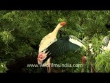 The Painted Stork (Mycteria leucocephala) is a large wading bird in the stork family. It is found in the wetlands of the plains of tropical Asia south of the Himalayas in South Asia and extending into Southeast Asia. Their distinctive pink tertial feathers give them their name. They forage in flocks in shallow waters along rivers or lakes. They immerse their half open beaks in water and sweep them from side to side and snap up their prey of small fish that are sensed by touch. As they wade along they also stir the water with their feet to flush hiding fish. They nest colonially in trees, often along with other waterbirds. They only sounds they produce are weak moans or bill clattering at the nest. They are not migratory and only make short distance movements in some parts of their range in response to food and for breeding. Like other storks, they are often seen soaring on thermals.<br /><br />Source- Wikipedia <br /><br />This footage is part of the professionally-shot broadcast stock footage archive of Wilderness Films India Ltd., the largest collection of imagery from South Asia. The Wilderness Films India collection comprises of thousands of hours of high quality broadcast imagery, mostly shot on HDCAM 1080i High Definition, HDV and XDCAM. Write to us for licensing this footage on a broadcast format, for use in your production! We are happy to be commissioned to film for you or else provide you with broadcast crewing and production solutions across South Asia. We pride ourselves in bringing the best of India and South Asia to the world... Reach us at wfi @ vsnl.com and admin@wildfilmsindia.com.